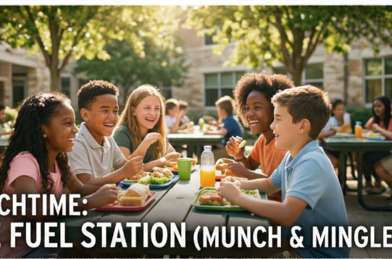 Ek sun-drenched outdoor courtyard jahan bacche picnic tables par baithkar khushi-khushi lunch kar rahe hain.